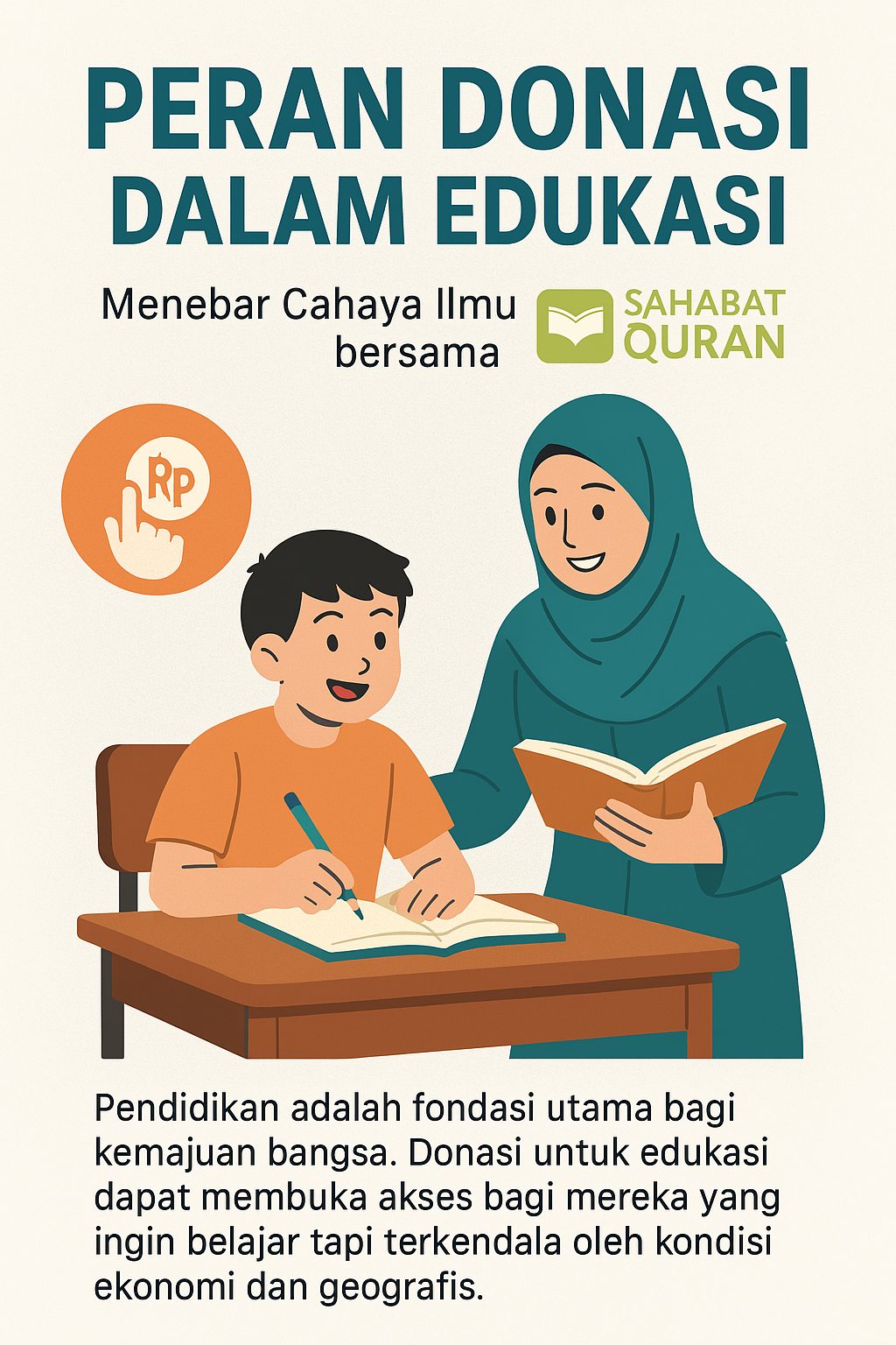 Peran Donasi dalam Edukasi: Menebar Cahaya Ilmu bersama Sahabat Quran Pendidikan adalah fondasi utama bagi kemajuan suatu bangsa. Namun, akses terhadap pendidikan yang layak masih menjadi tantangan di banyak wilayah, terutama di daerah terpencil dan tertinggal. Di sinilah peran donasi menjadi sangat penting—sebagai jembatan harapan bagi mereka yang ingin belajar, namun terbatas oleh kondisi ekonomi dan geografis. Donasi: Bukan Sekadar Memberi, Tapi Mengubah Hidup Donasi untuk pendidikan bukan hanya tentang memberi uang, melainkan tentang memberi peluang. Setiap rupiah yang disalurkan dapat mengubah hidup seseorang—membuka akses terhadap ilmu, memperluas wawasan, dan menumbuhkan semangat juang untuk meraih masa depan yang lebih baik. Salah satu bentuk nyata kontribusi ini bisa dilihat dari program-program edukatif yang digerakkan oleh lembaga sosial dan pendidikan seperti Sahabat Quran. Sahabat Quran: Menerangi Pelosok Negeri dengan Cahaya Ilmu Sahabat Quran adalah lembaga yang berkomitmen untuk menyebarkan nilai-nilai Al-Qur’an melalui berbagai program pendidikan dan dakwah. Fokus utamanya adalah mendukung generasi muda agar tumbuh sebagai pribadi yang berakhlak mulia dan berilmu, dengan menjadikan Al-Qur’an sebagai pedoman hidup. Melalui program seperti Beasiswa Penghafal Quran, Pembangunan Rumah Quran, dan Distribusi Al-Qur’an ke Pelosok Negeri, Sahabat Quran tidak hanya mengajarkan ilmu agama, tetapi juga menanamkan nilai-nilai kemanusiaan, tanggung jawab, dan cinta belajar sejak dini. Peran Donatur dalam Menopang Program Edukasi Keberhasilan program-program ini tidak lepas dari peran para donatur. Donasi yang terkumpul digunakan untuk: Menyediakan fasilitas belajar yang layak di daerah terpencil Memberikan beasiswa bagi anak-anak yatim dan dhuafa yang ingin belajar Al-Qur’an Membantu operasional pengajar dan da’i yang mengabdi di daerah 3T (Terdepan, Terluar, Tertinggal) Mendistribusikan mushaf Al-Qur’an dan buku-buku edukatif ke berbagai wilayah Investasi Akhirat yang Berdampak Panjang Dalam Islam, amal jariyah seperti mendukung pendidikan adalah salah satu investasi akhirat yang tak terputus pahalanya. Rasulullah ﷺ bersabda: “Jika seseorang meninggal dunia, maka terputuslah amalannya kecuali tiga: sedekah jariyah, ilmu yang bermanfaat, dan anak shalih yang mendoakannya.” (HR. Muslim) Dengan berdonasi melalui Sahabat Quran, Anda tidak hanya membantu mencerdaskan kehidupan bangsa, tetapi juga menanamkan amal yang terus mengalir pahalanya—karena ilmu yang bermanfaat akan terus tersebar dan menginspirasi generasi demi generasi. Ajak Kebaikan, Tebar Manfaat Kini saatnya Anda menjadi bagian dari perubahan. Bukan semua orang mampu mengajar, tapi semua orang bisa membantu pendidikan berjalan. Donasi Anda, sekecil apapun, bisa menjadi cahaya di tengah kegelapan—menyulut semangat, menumbuhkan harapan. Mari dukung pendidikan bersama Sahabat Quran. Karena ketika kita bantu satu orang untuk belajar, kita sesungguhnya sedang bantu membangun masa depan umat. link Donasi https://sahabatquran.org/donation-details?s=donasi-al-qur-an-pendidikan